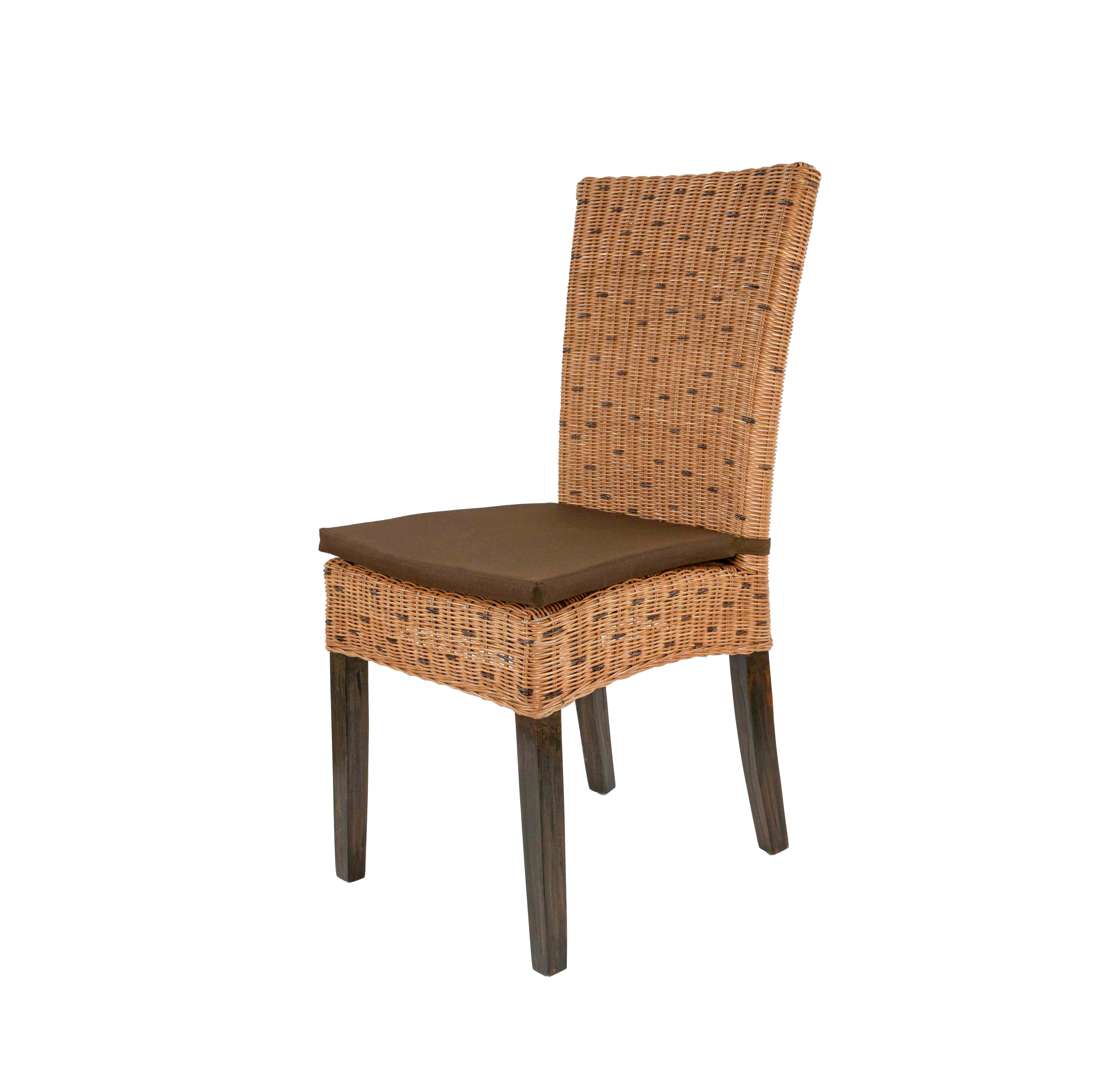 Ontdek deze prachtige en stevige eetkamerstoel van pitriet met een comfortabel bruin kussen.