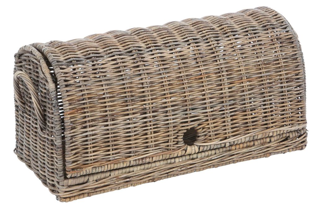 Rieten mand voor het opbergen van brood. Leuk voor op het aanrecht. De mand is voorzien van een ijzeren frame met een klep.