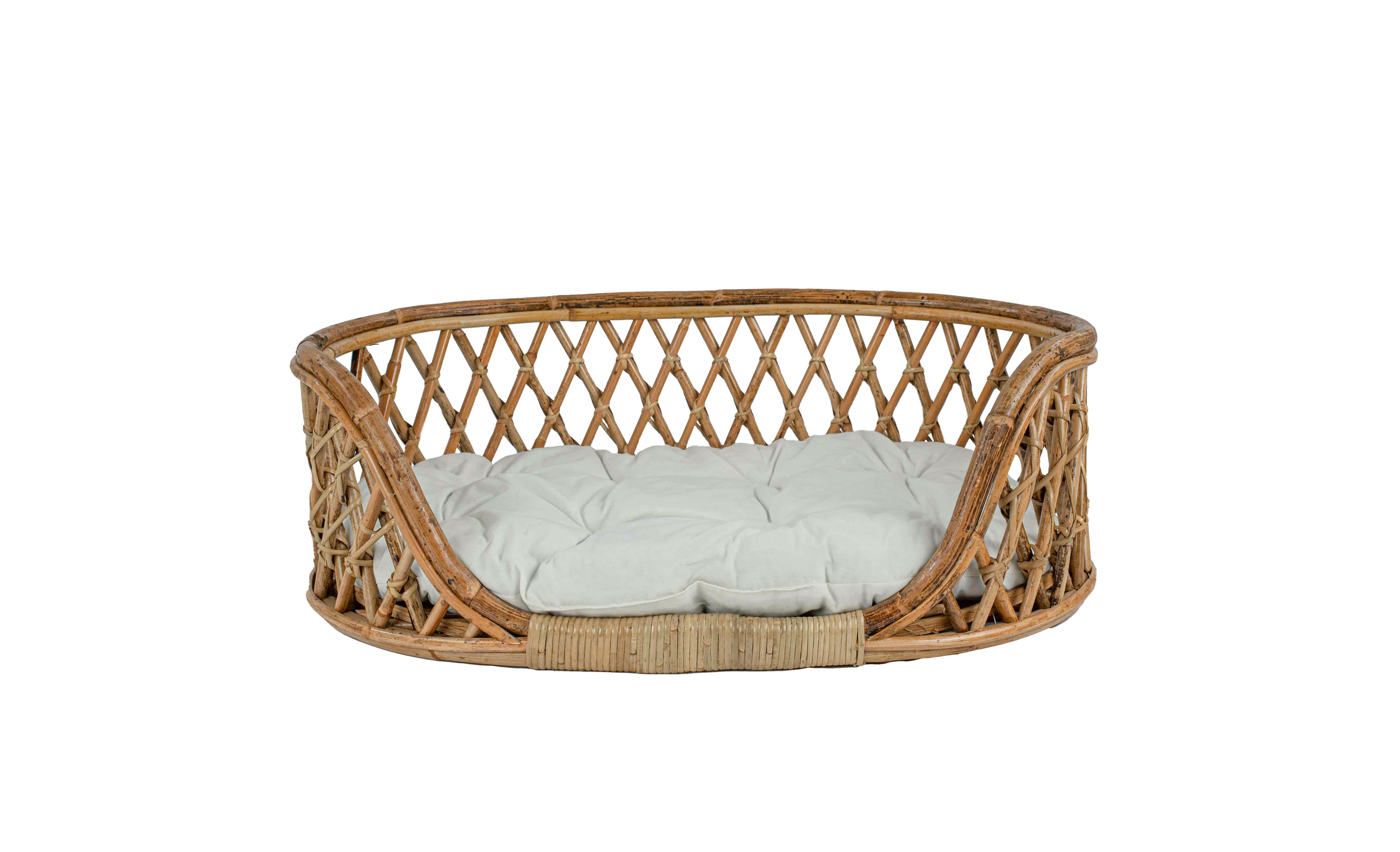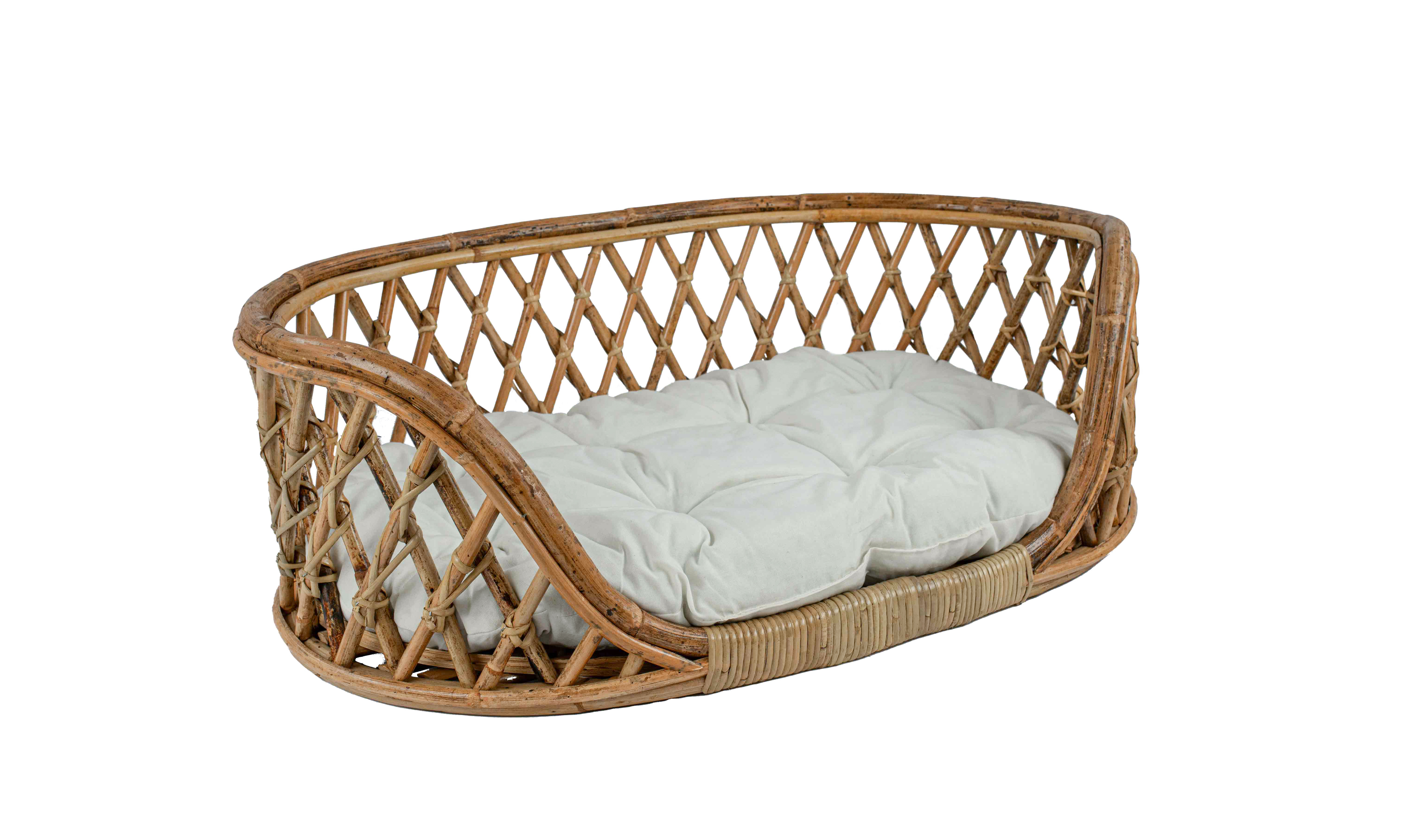 De opengewerkte rotan hondenmand met kussen heeft aan 1 kant een lagere instap.