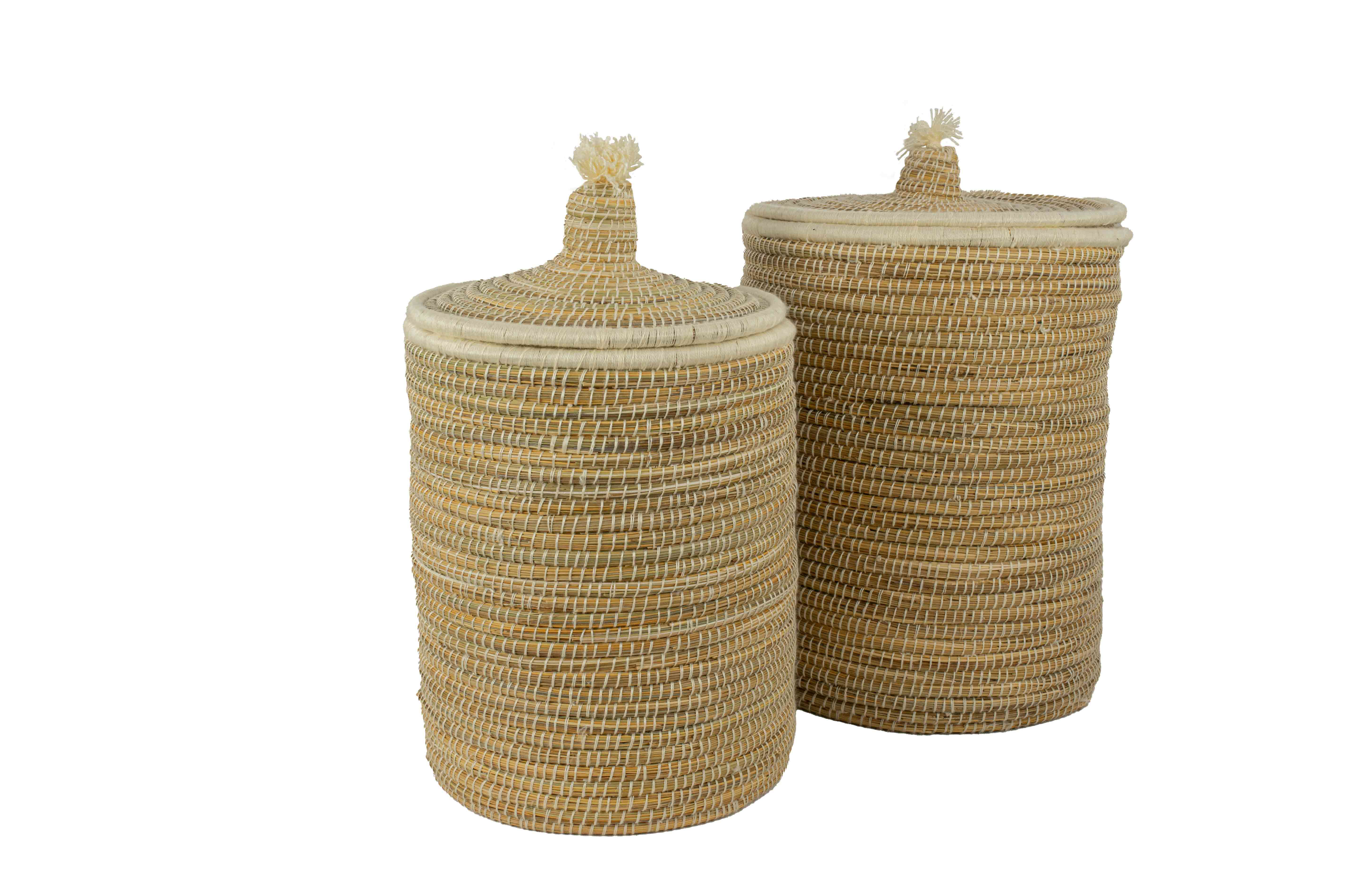 Wasmand / Opbergmand van zeegras met deksel en pluim